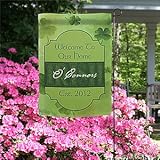 , Extend a warm, Irish greeting with our An Irish Welcome© Personalized Garden Flag & Stand.Our all-weather, double-sided flag features your family name delicately scripted across the word "IRISH."Then, choose to include any greeting across the top - the traditional Irish welcome "Cead mile Failte" which means "One Hundred Thousand Welcomes" or simply "Welcome To Our Home." Also, include any 1 line message at the bottom of the design. Design is printed on a removable flag so you can replace with other designs, as desired. Choose to purchase the complete garden flag set or flag alone to be interchanged.Makes a special housewarming gift! ...
